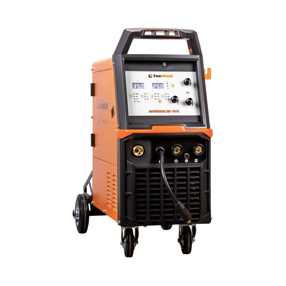 FOXWELD INVERMIG 251 SYN — промышленный многофункциональный трёхфазный синергетический инвертор, позволяющий производить сварку изделий из низкоуглеродистой и легированной стали и алюминия. Аппарат выполнен в едином корпусе со встроенным мощным 4-роликовым механизмом подачи проволоки, рассчитанным для использования катушек D200 (5кг) и D300 (15 кг). 2 цифровых дисплея на панели управления, мощная ручка на корпусе, платформа на колёсах для перемещения с местом для установки баллона с газом – в аппарате есть всё для проведения сварочных работ в сервисных металлоцентрах и при монтаже различных металлоконструкций.РАБОТА БЕЗ ОСТАНОВКИ: ПВ 100% на максимальном токе при КПД 85% обеспечивает бесперебойную устойчивую работу на протяжении всего трудового дня. На задней панели расположена розетка 36 В для подключения подогревателя газа, который необходим для защиты обледенения редуктора во время продолжительной работы.МНОГОФУНКЦИОНАЛЬНОСТЬ 3-В-1: Благодаря своей многофункциональности, аппарат позволяет проводить следующие процессы сварки: полуавтоматическую сварку сплошной проволокой в среде защитных газов с ручным режимом настройки параметров сварки, с синергетическим управлением параметрами сварки (MIG/MAG), полуавтоматическую сварку самозащитной проволокой без использования защитного газа, ручную дуговую сварку штучным электродом с покрытием (ММА), аргонодуговую сварку на постоянном токе с возбуждением дуги касанием вольфрамового электрода (TIG LIFT).СИНЕРГЕТИЧЕСКИЙ РЕЖИМ УПРАВЛЕНИЯ: Полностью синергетическое управление "одной кнопкой". Режим синергетики позволяет сэкономить время и получить качественное сварное соединение даже новичку, так как основные сварочные параметры подбираются автоматически. С помощью синергетического режима управления можно легко и быстро настроить аппарат под любую задачу. Преимущества синергетики: простота в настройке даже неквалифицированным персоналом, быстрая установка сварочных параметров, высокая производительность, гарантированное получение качественного сварного соединения. Синергетику можно отключить для работы в ручном режиме.4-РОЛИКОВЫЙ МЕХАНИЗМ ПОДАЧИ: 4-роликовый механизм подачи с 4-мя ведущими роликами подаёт проволоку в область сварки без проскальзывания и рывков при использовании длинных сварочных горелок, что обеспечивает меньшее давление и деформацию сварочной проволоки. Механизм подачи с 4-мя ведущими роликами отлично подходит для сварочной порошковой проволоки, проволоки, сделанной из алюминия, и даёт дополнительные преимущества при производстве и в монтажных условиях. Подача проволоки осуществляется с высокой точностью и надёжностью, что влияет на производительность, качество сварочного шва и время использования сварочного аппарата.ФУНКЦИЯ VRD: Функция VRD (снижение напряжения холостого хода) повышает безопасность и исключает риск поражения сварщика электрическим током. Сварочный процесс становится более безопасным в замкнутых пространствах и при сварке в условиях повышенной влажности.ПРЕИМУЩЕСТВА:Синергетический режим управленияАргонодуговая сварка (TIG LIFT) на постоянном токеСварка без газа самозащитной проволокойСинергетический режим управленияРежим работы горелки 2Т / 4Т / Special 4TФункции Hot Start (Горячий Старт), AntiSticking (Антизалипание) и Arc Force (Форсаж Дуги)Функция VRD (сниж